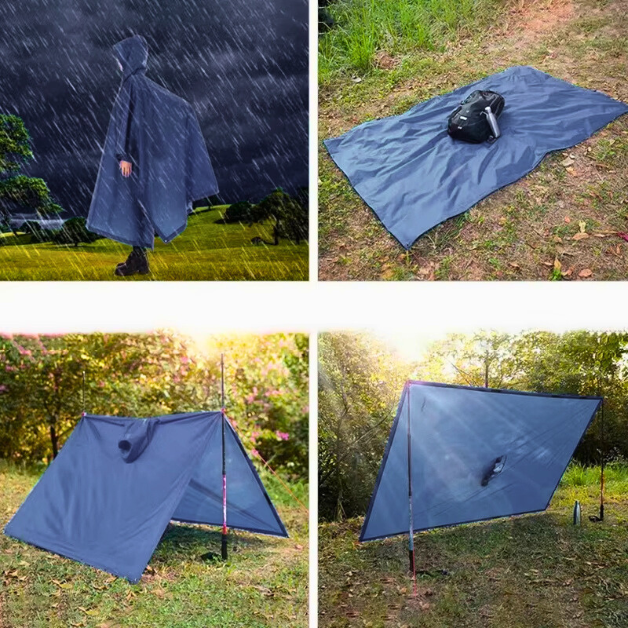 Mit wenigen Handgriffen wird aus dem Poncho ein Zeltdach, eine Bodenmatte oder ein winddichter Umhang.