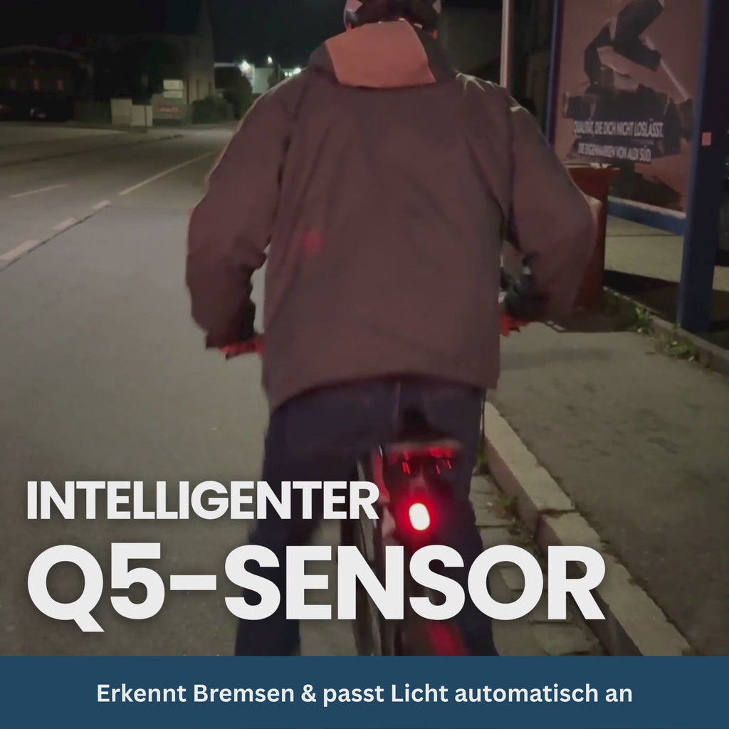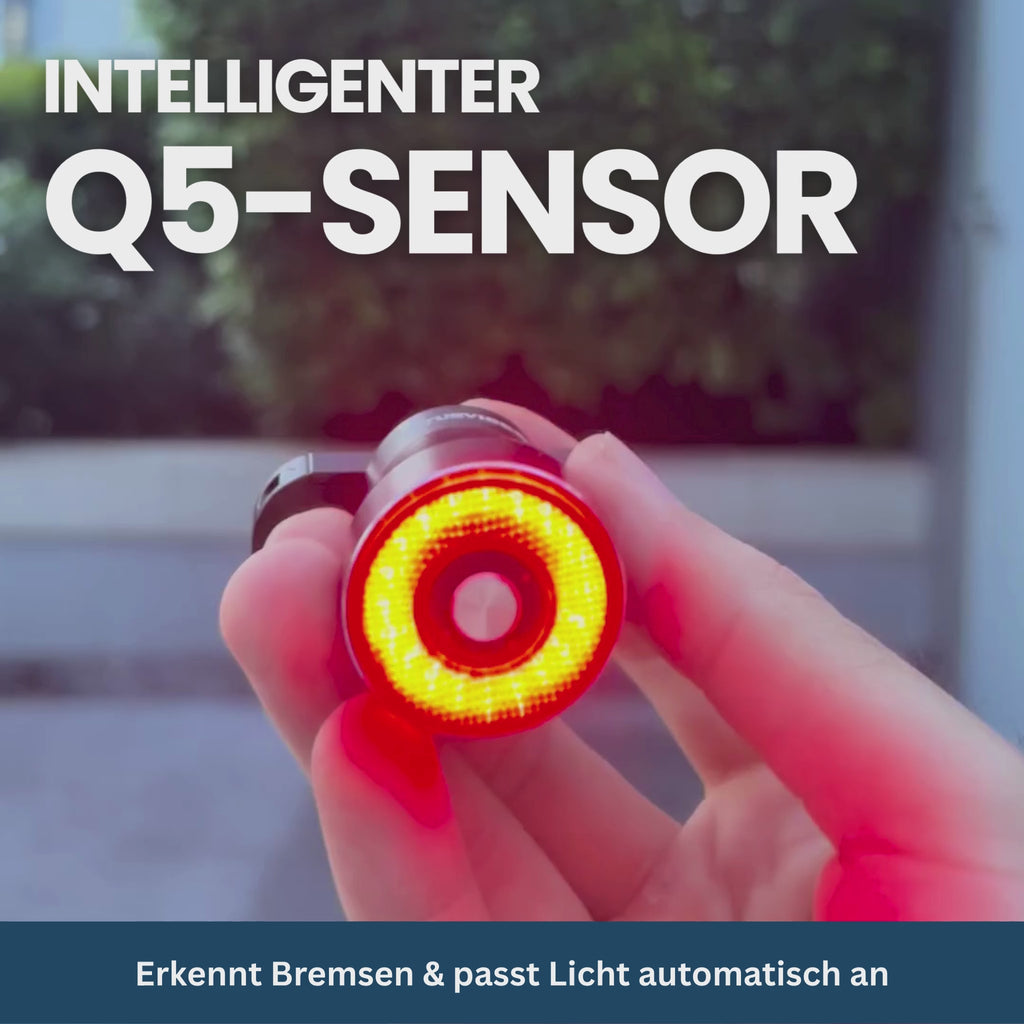 Der hochintelligente Q5-Sensor erkennt einen Bremsvorgang beim Radfahren sofort und aktiviert sofort das Bremslicht des Smartlights.