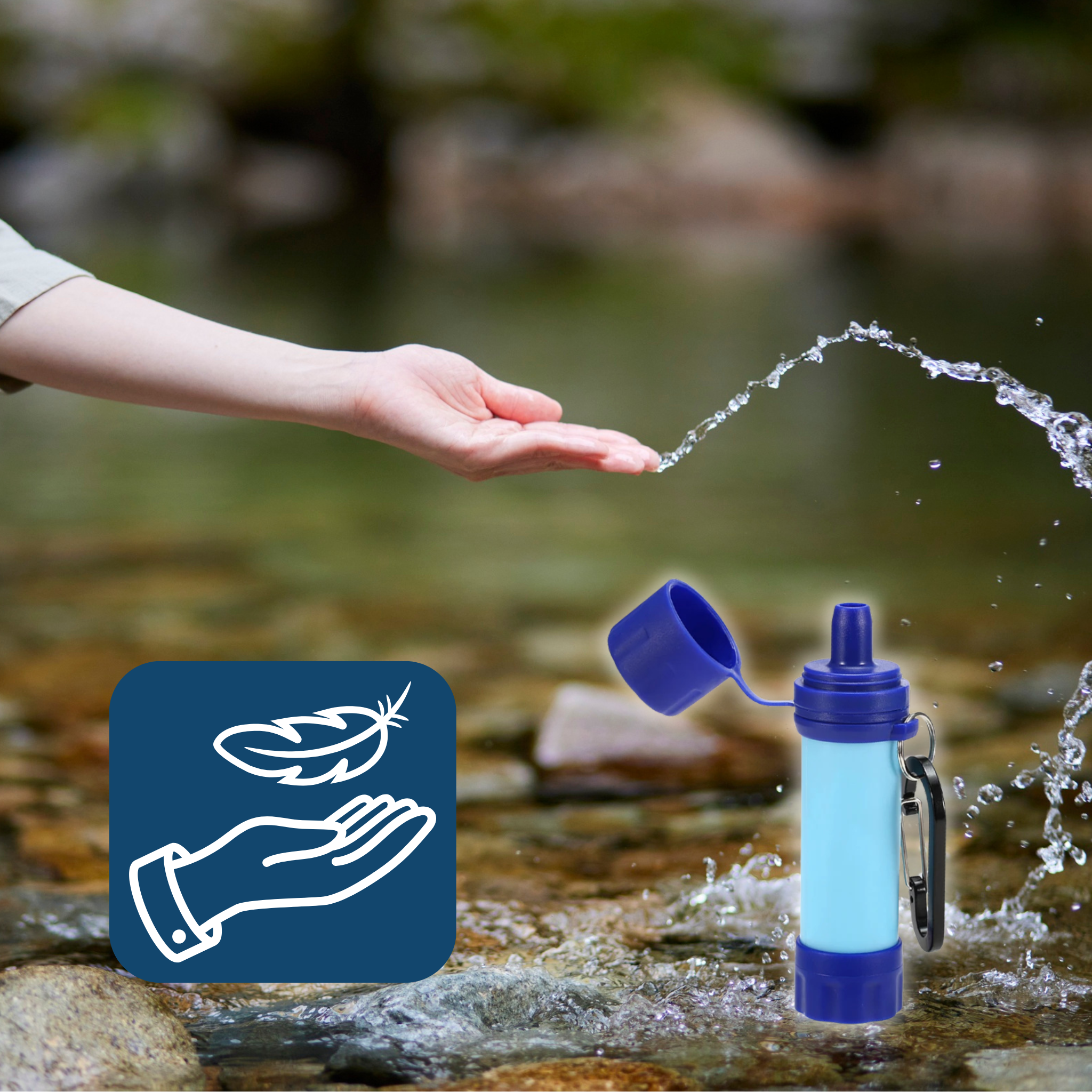Erlebe die Freiheit, jederzeit sicheres Wasser in der Natur zu trinken mit diesem tragbaren Wasserfilter, perfekt für Outdoor, Camping, Wandern und Survival.