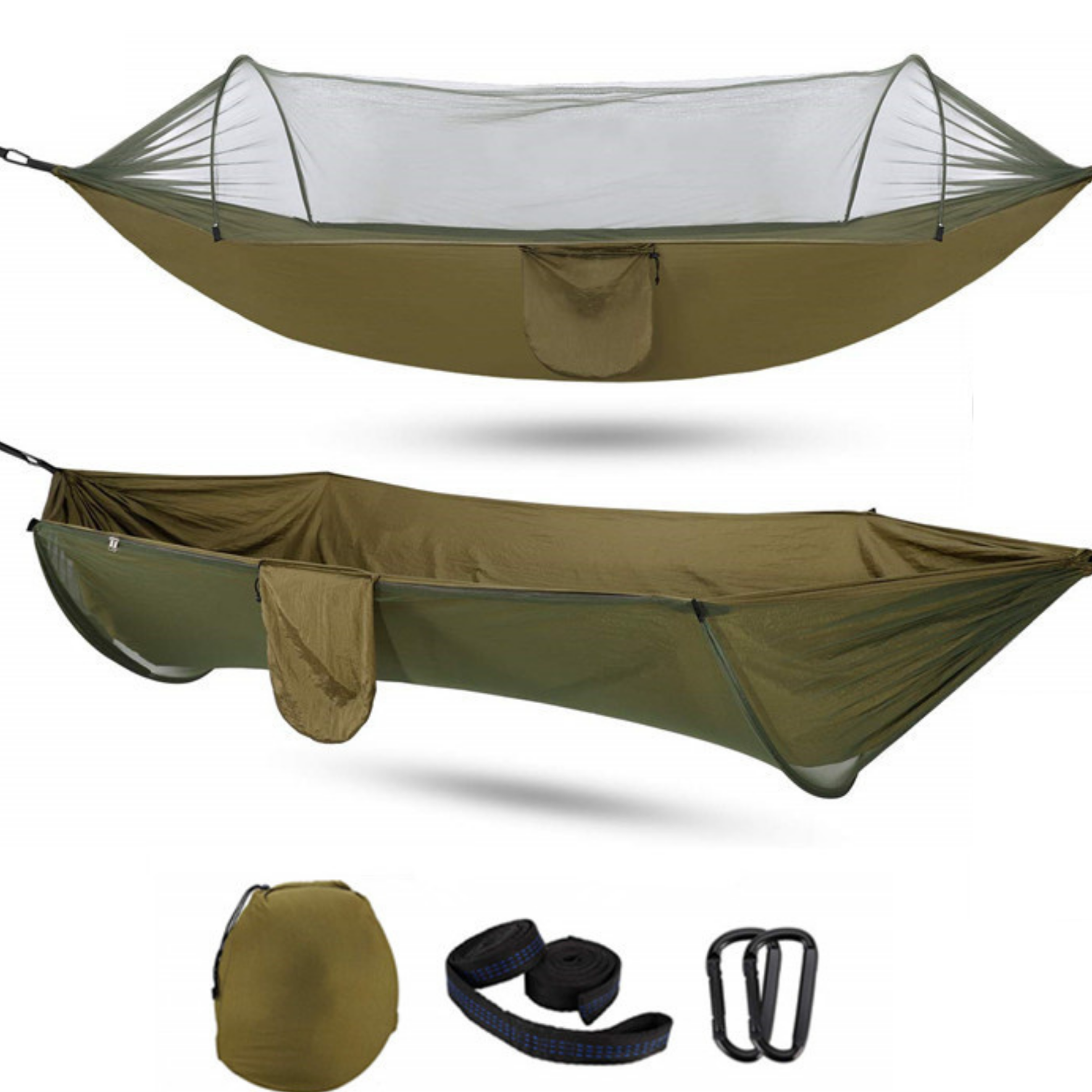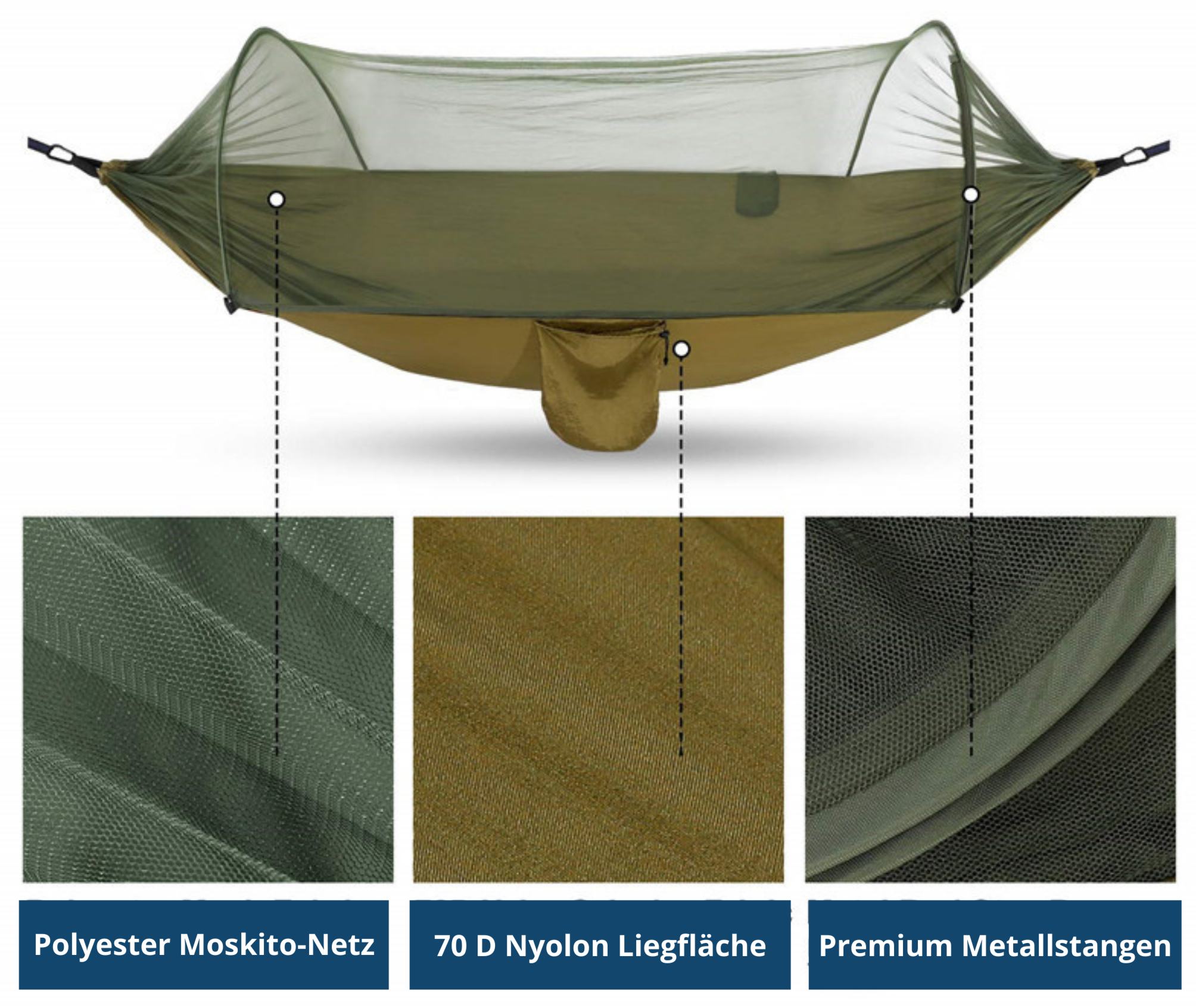 Die Liegefläche besteht aus 70D Nylon, das Moskito-Netz besteht aus hochwertigem Polyester und die Netzstangen aus flexiblen und robusten Metallstangen.