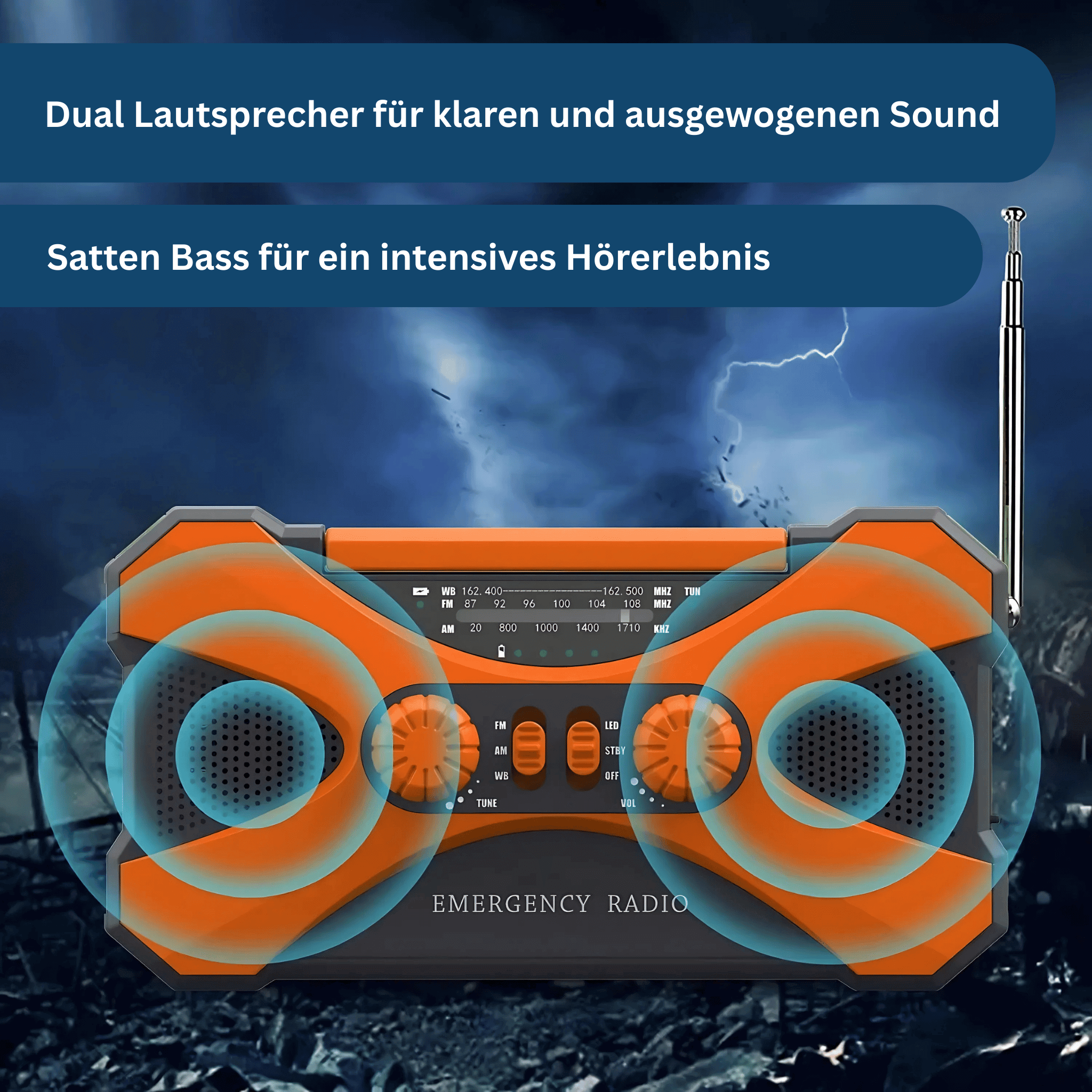 Mit dem Power Notfallradio erhältst du aktuelle Informationen über Wetterwarnungen, Stürme oder andere kritische Ereignisse direkt auf dein Gerät.