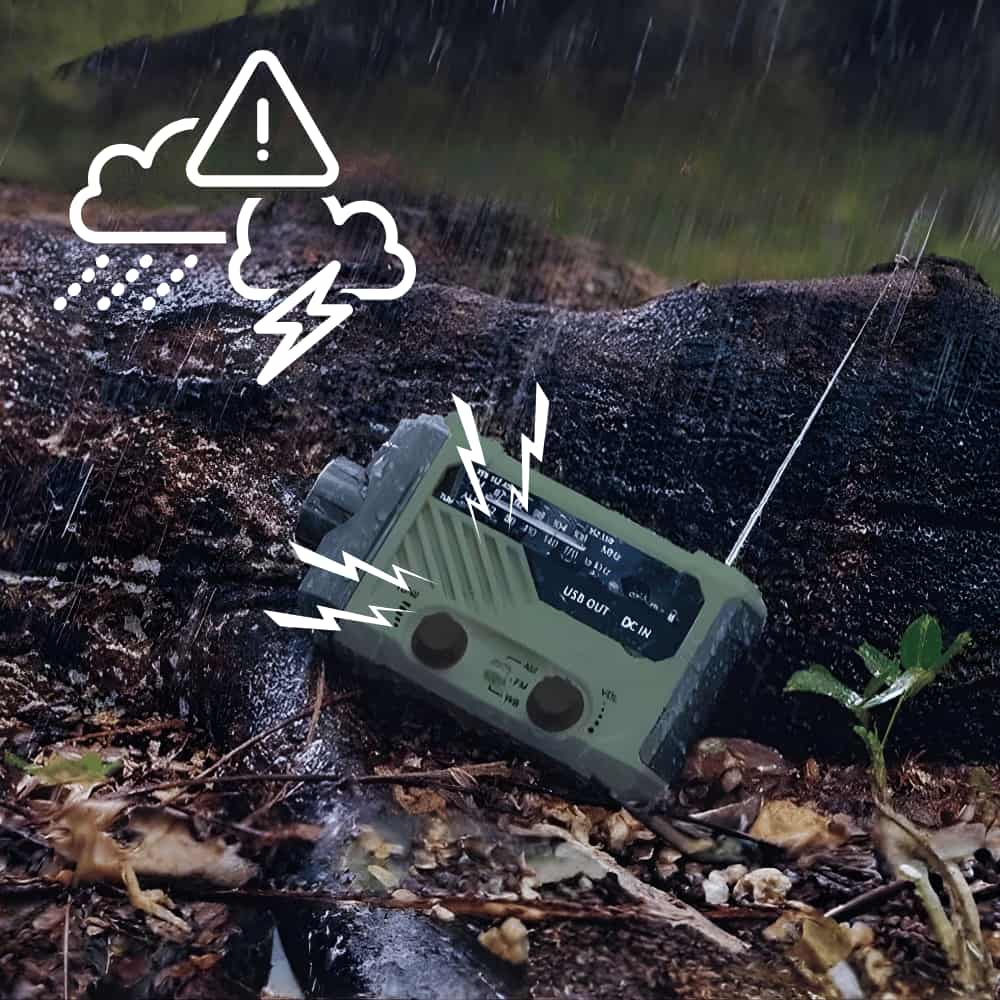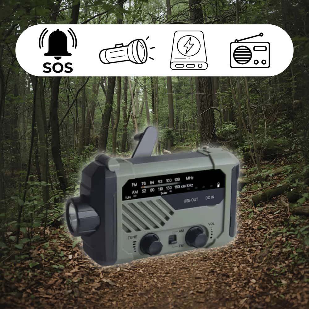 Es empfängt FM-, AM- und WB-Frequenzen (manuell einstellbar auf 7 NOAA-Wetterkanäle) und versorgt dich zuverlässig mit Informationen zu Stürmen, Überschwemmungen oder Waldbränden.