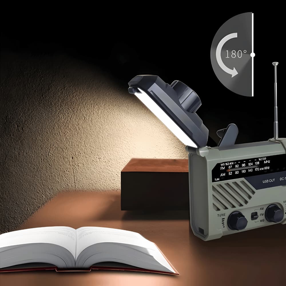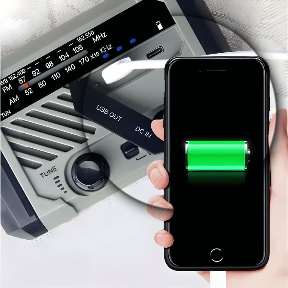 Das Radio kann auf vier Arten geladen werden: über Solarenergie, Handkurbel, USB-Kabel oder eine austauschbare Batterie. So bleibst du auch ohne Stromquelle jederzeit einsatzbereit.