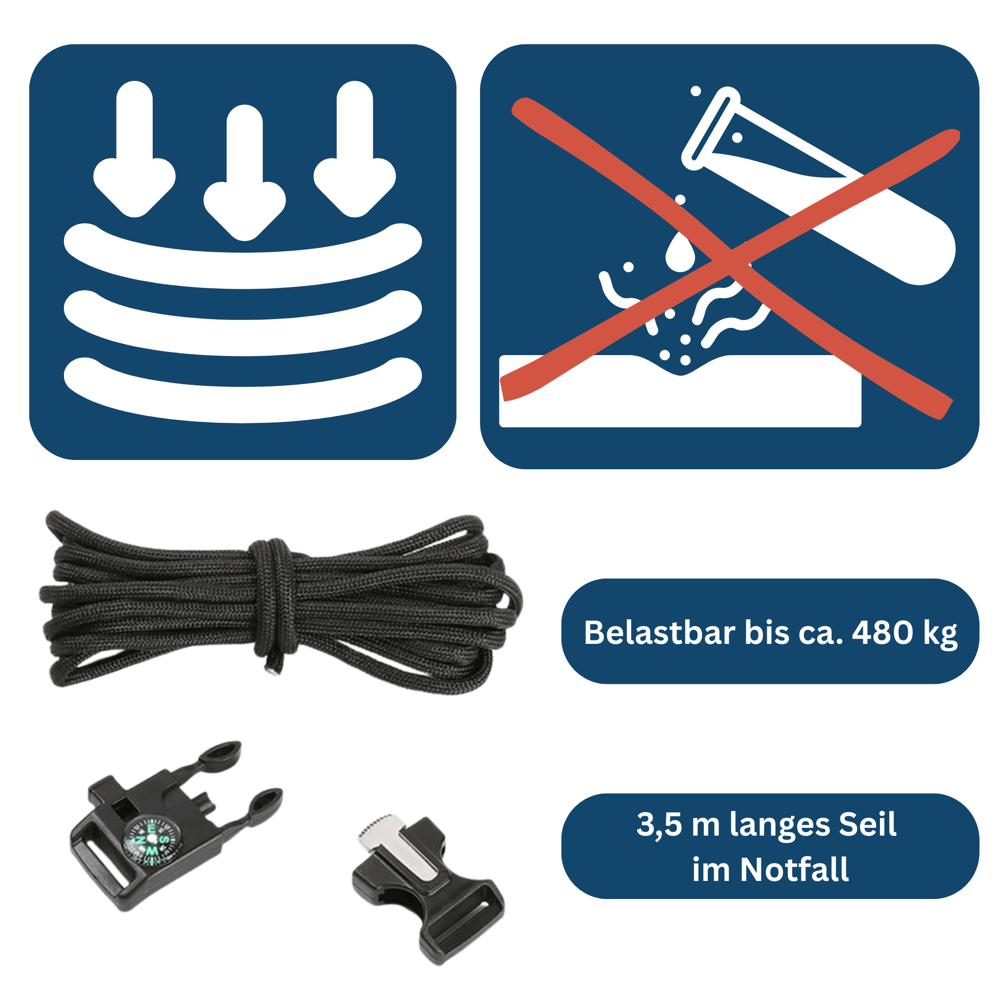 Gefertigt aus hochwertigem Fallschirmseil mit 4 mm Durchmesser hält es einer Zugkraft von etwa 480 kg stand. Das Seil kann im Notfall auf ca. 3,5 Meter Länge entfaltet werden und ist abrieb- und korrosionsbeständig.