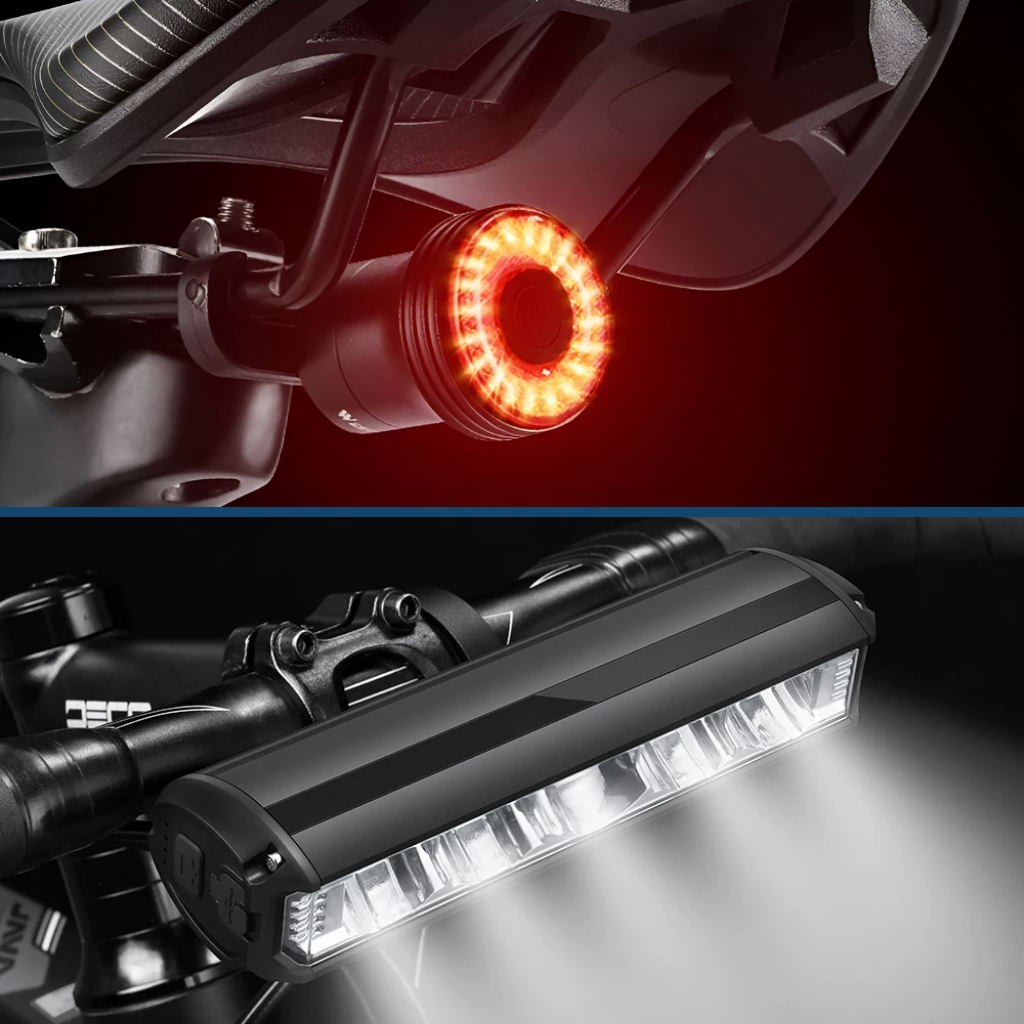 Das Safe-Ride Bundle kombiniert ein leistungsstarkes Maxi-Frontlicht mit 6000 Lumen und ein intelligentes Smartlight mit Q5-Sensor, das auf Bremsvorgänge reagiert.