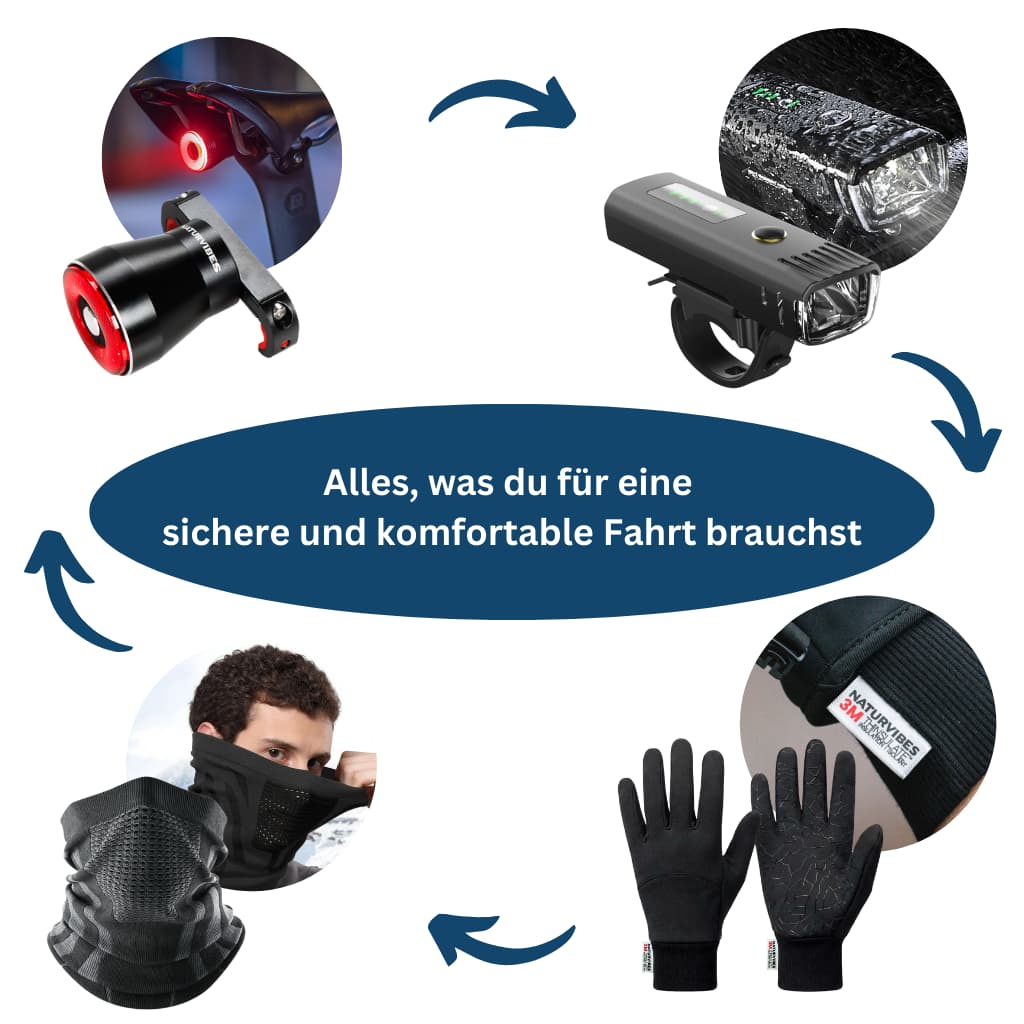 Ob bei Tag oder Nacht, bei Kälte oder Nässe – dieses Set rüstet dich optimal aus und kombiniert leistungsstarke Beleuchtung mit funktionalem Zubehör für ein angenehmes Fahrerlebnis.
