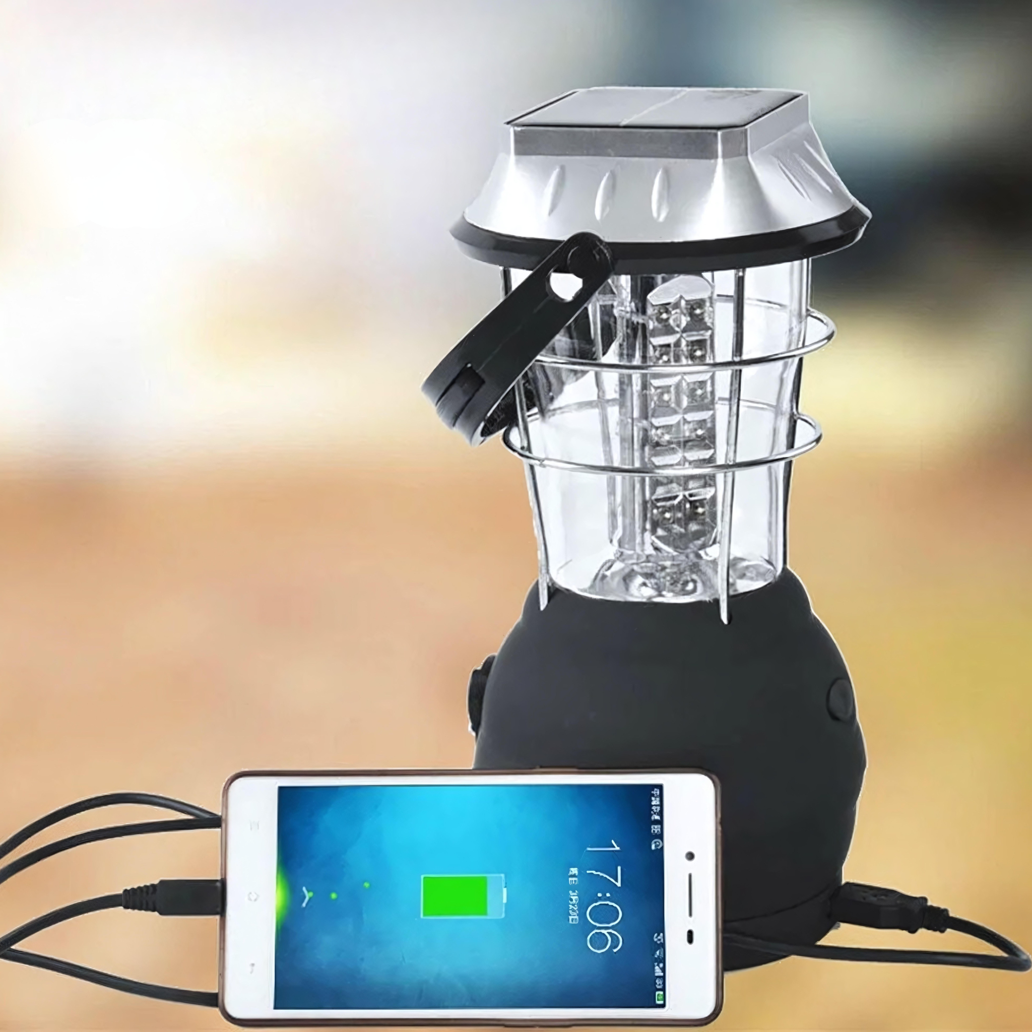 Du kannst die Laterne mit Solarenergie aufladen, über die Handkurbel zuverlässig Notstrom erzeugen oder sie per USB mit einer Powerbank oder Steckdose verbinden.