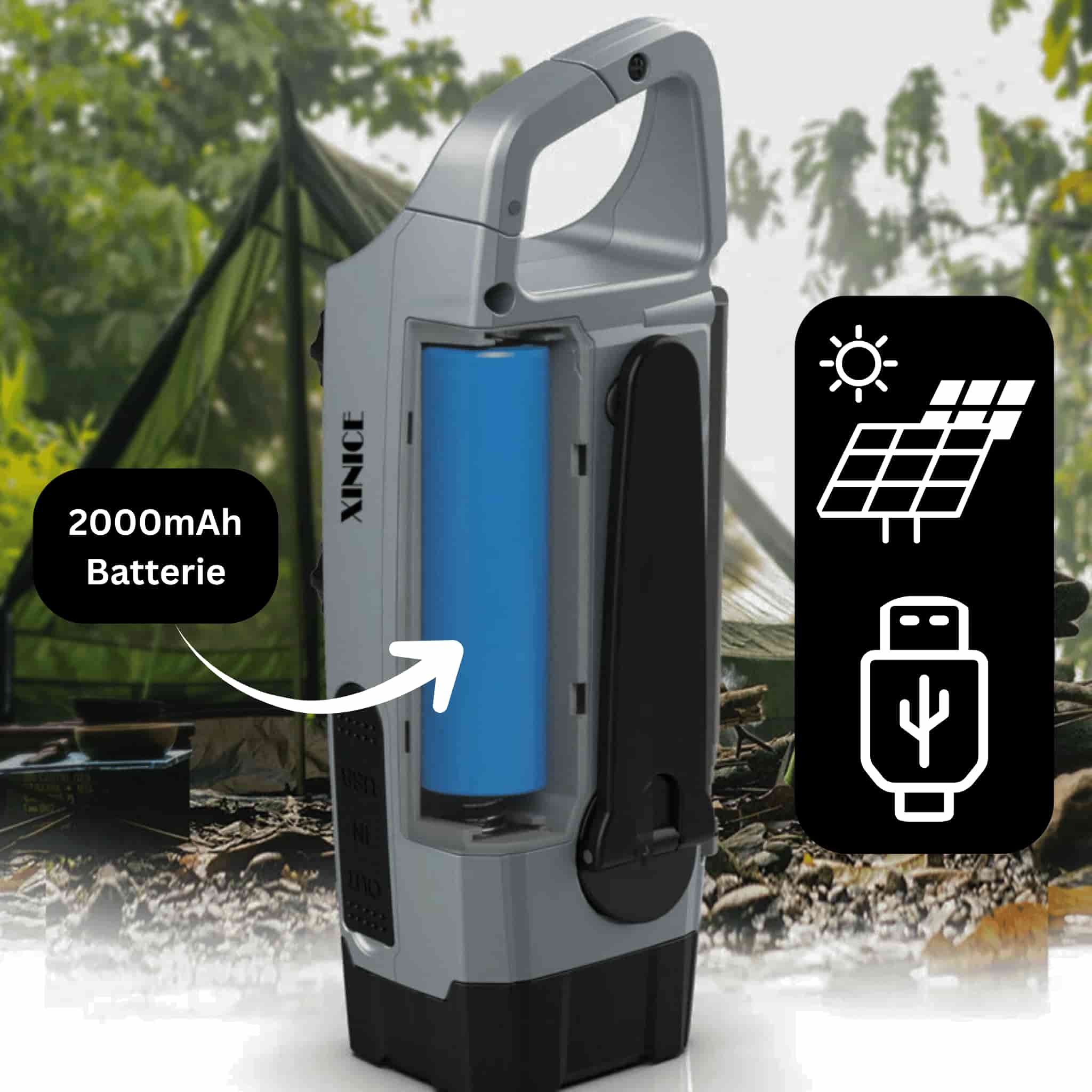 Der Karabiner ermöglicht die einfache Befestigung am Rucksack, die abnehmbare Batterie sorgt für flexibles Laden, und die hochwertige Bauweise hält selbst extremen Outdoor-Bedingungen stand.