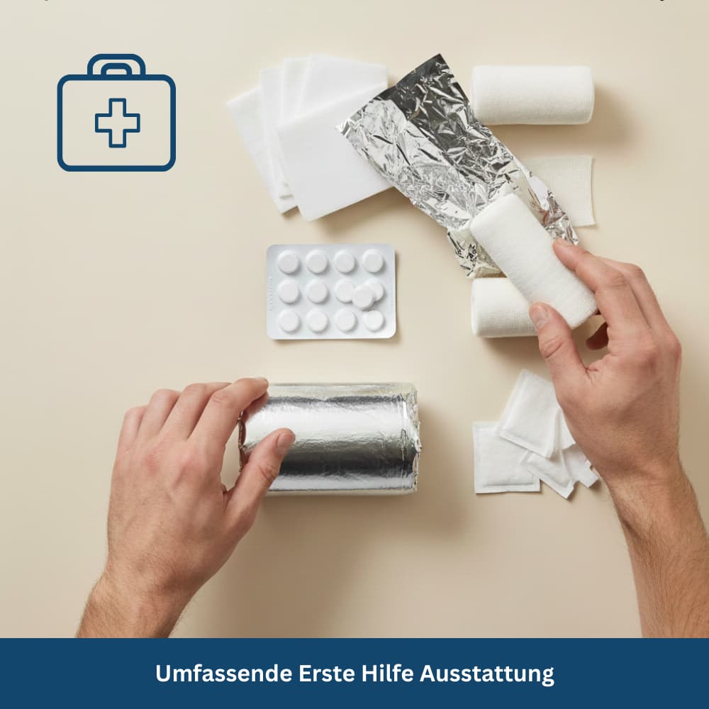 Gaze, PBT Bandagen, Tourniquet, Rettungsdecke, Jodtabletten und Alkoholtabs ermöglichen dir eine schnelle und effektive Versorgung.