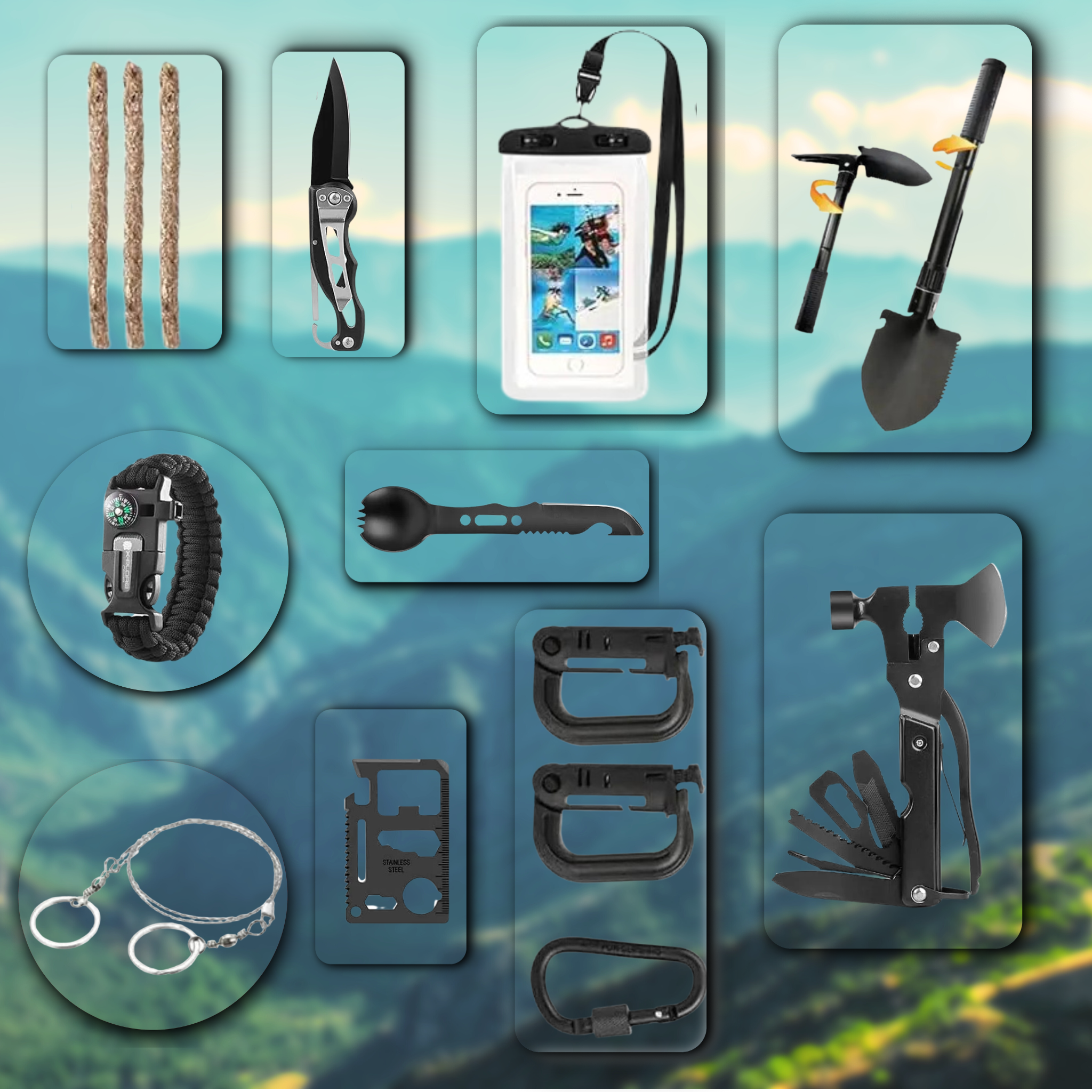 Das Set vereint 250 sorgfältig ausgewählte Survival-Tools, Erste-Hilfe-Materialien und praktische Outdoor-Gadgets, die dich beim Wandern, Campen oder in unvorhergesehenen Situationen unterstützen.
