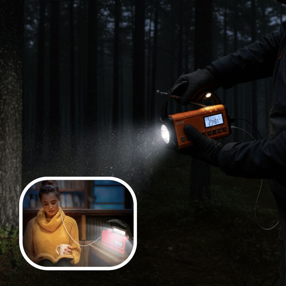 Dieses kompakte Multitalent vereint Radio, Taschenlampe, Leselampe, Powerbank und SOS-Alarm in einem hochwertigen Gerät.