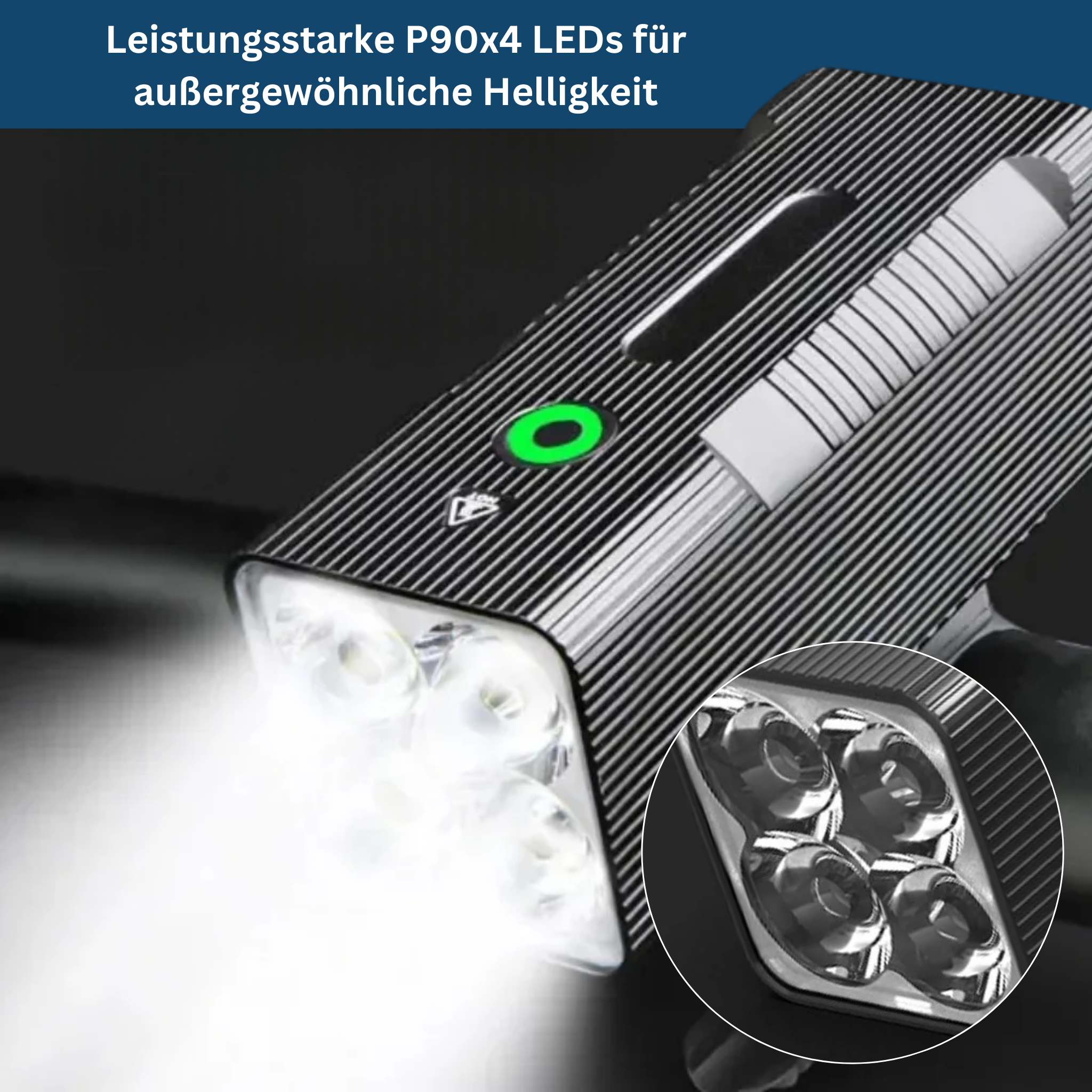 Das Ultra-Frontlicht setzt auf leistungsstarke P90x4 LEDs, die eine außergewöhnliche Helligkeit bieten.