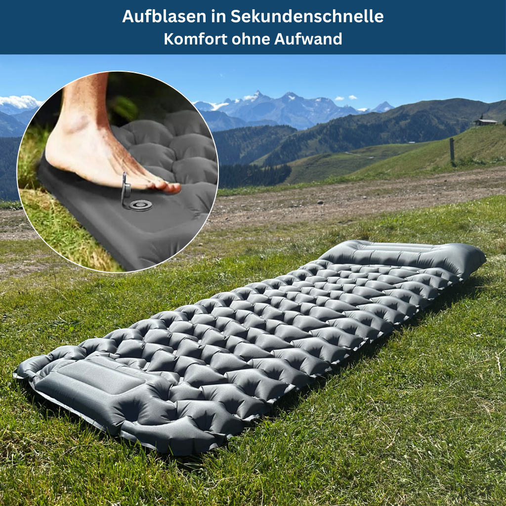Mit der eingebauten Fußpumpe kannst du die Isomatte in nur 30 Sekundenvollständig aufpumpen, ohne mühsames Blasen per Mund oder sperrige Pumpen.